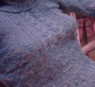 Mangas: Comece com 58 corr., e tecer em p. fantasia, mudando de cor a cada 4 voltas ate completar 44 cm. Faça 3 voltas mais da seguinte forma (ver esquema):