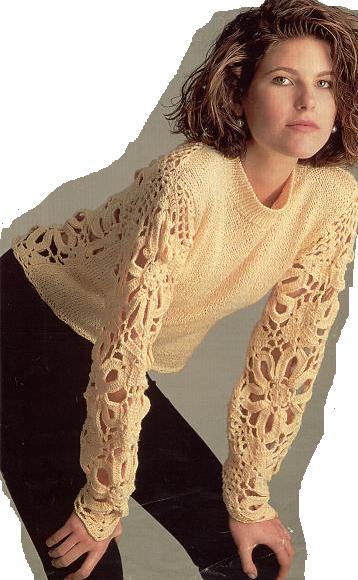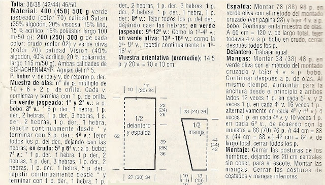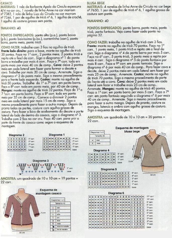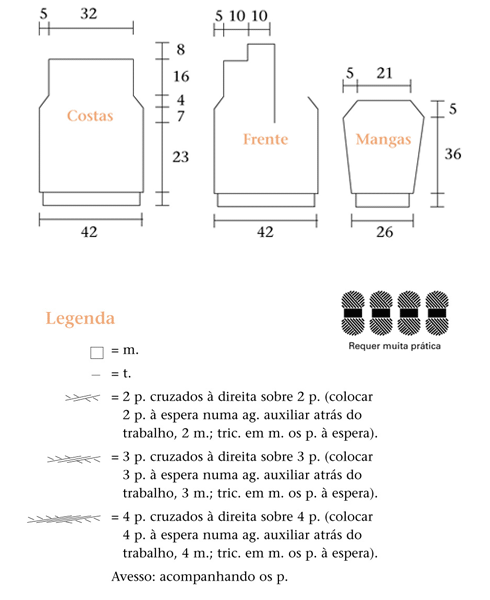 aumente 8pts., e siga em ponto meia, aumentando de cada lado a cada 8 carr. 1p (4v) e a cada 12 carr. 1p (3v)MONTAGEM: Costure lateral da blusa, pregue as mangas.